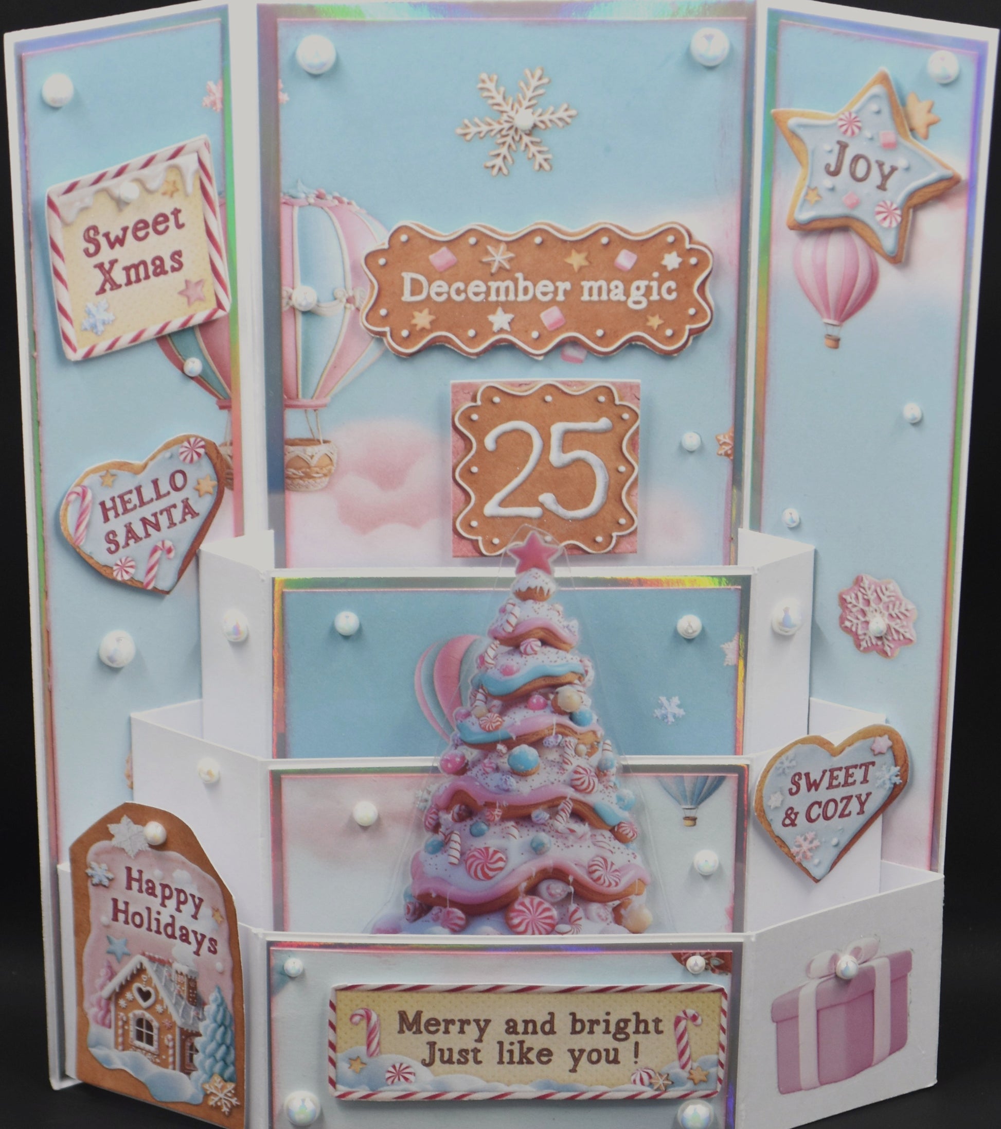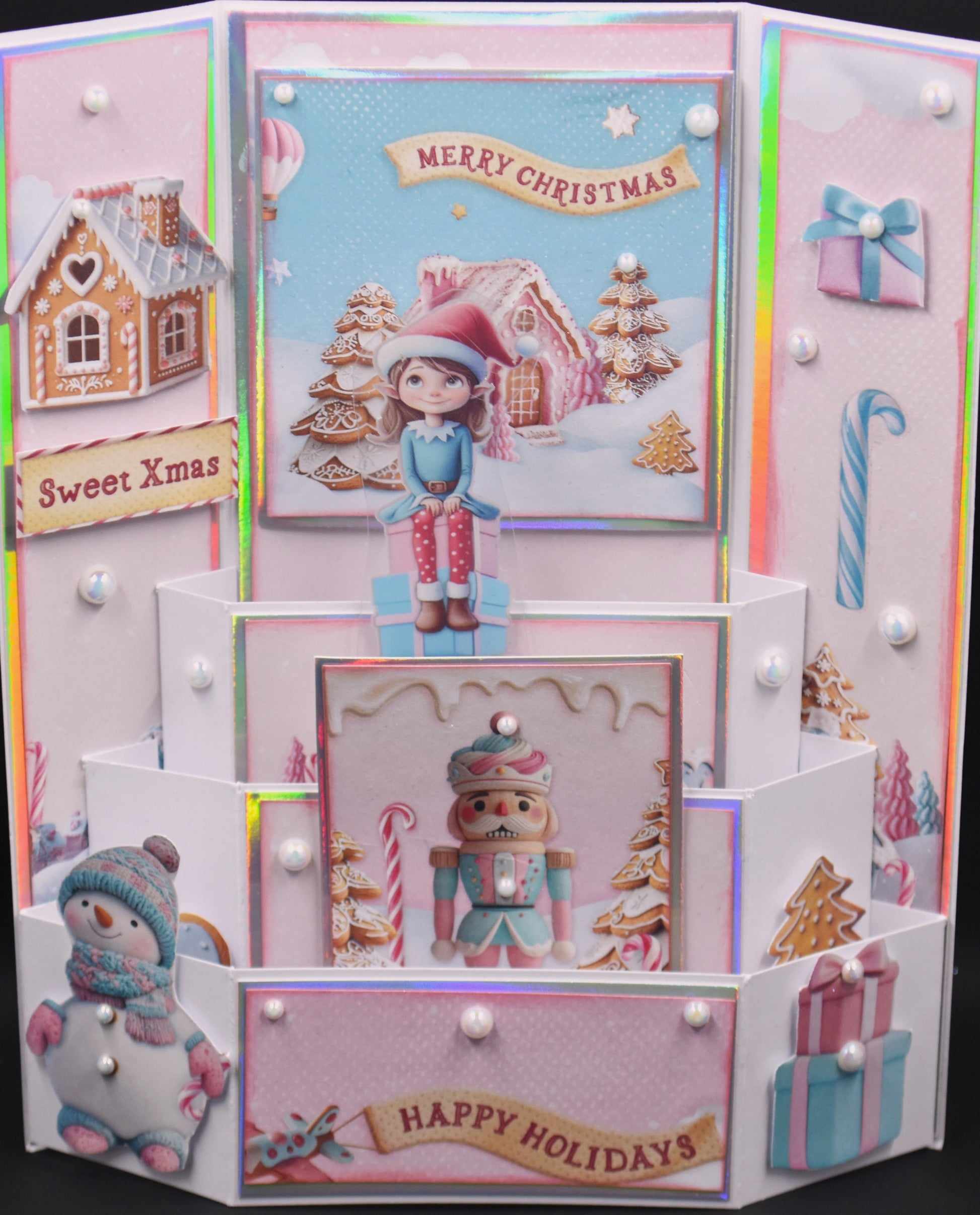 Ready to assemble card kit featuring the Stamperia Candy Christmas collection- which includes an 8x8 single sided paper pack and rub ons as well as lots of bling and mirror board.